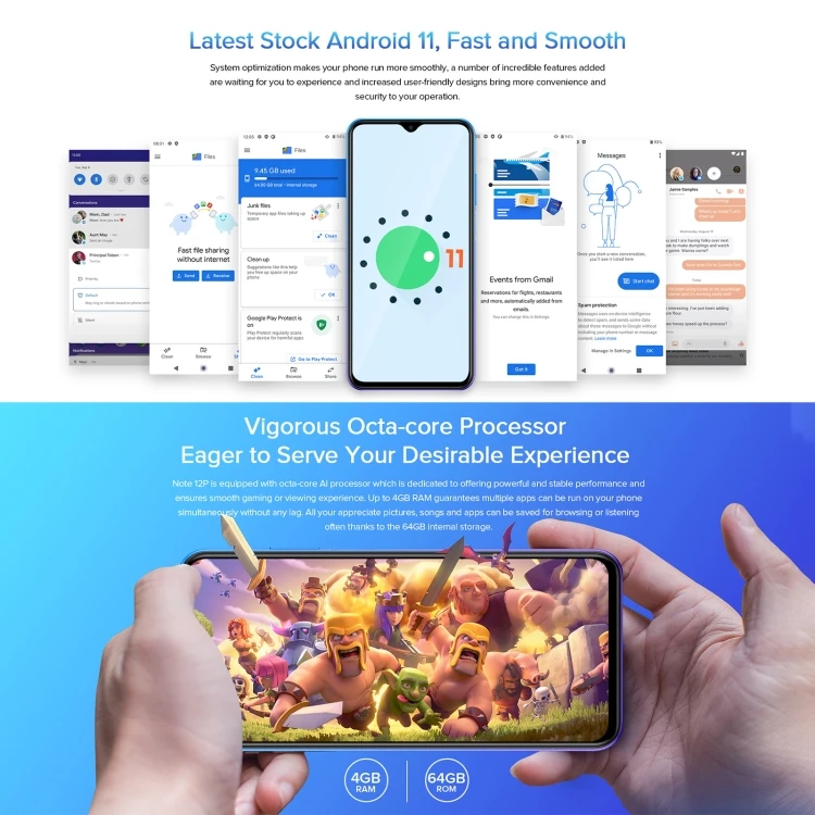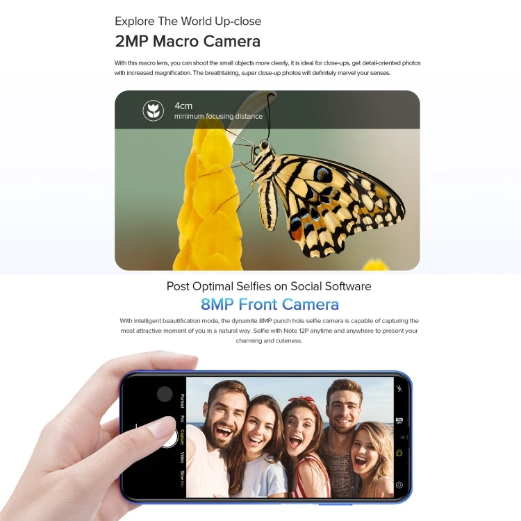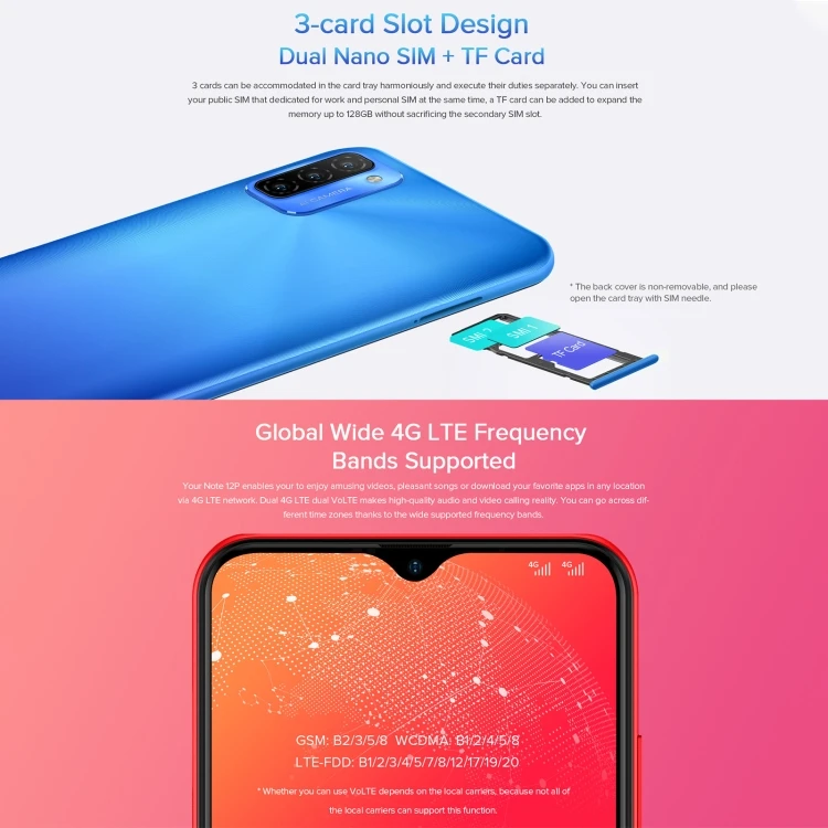 General Model Note 12P Central Processing Unit(CPU) SC9863A Octa Core up to 1.6GHz GPU IMG8322 MP1 up to 550MHz Shell Material PC SIM Quantity Dual SIM SIM Types Nano SIM Card OS System Android 11 RAM 4GB ROM 64GB External memory TF card up to 128GB (not included) Sensor Light sensor, Proximity sensor, Acceleration sensor, Fingerprint sensor Support Language Arabic, Bengali, Bulgarian, Burmese, Dutch, Czech, Catalan, Croatian, Danish, French, English, Finnish, Filipino, Greek, German, Hindi, Hungarian, Hebrew, Indonesian, Italian, Japanese, Latvian, Malay, Norwegian, Persian, Portuguese, Polish, Russian, Romanian, Serbian, Swedish, Spanish, Turkish, Thai, UKrainian, Vietnamese, Simple Chinese, Traditional Chinese, Urdu, Armenian, Korean, Estonian, Lithuanian, Slovak Breathing Light Blinking Notification Light, Battery Status Light Additional Features Broadcast, FM, OTG, VOLTE(need the operator support), Face unlock Fingerprint Side-mounted